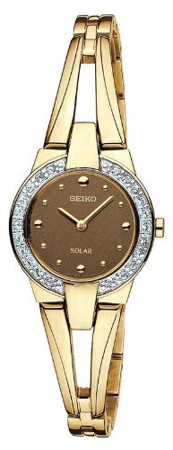 Gold-plated stainless steel case with a gold-plated stainless steel bracelet. Fixed gold-plated bezel set with 22 Swarovski crystals. Brown dial with gold-tone hands and dot hour markers. Solar powered quartz movement. Scratch resistant Hardlex crystal. Gold-tone crown. Solid case back. Case diameter: 22 mm. Jewelry clasp. Water resistant at 30 meters/ 100 feet. Functions: hours, minutes. Seiko Brown Dial Gold-tone Solar Ladies Watch SUP054.Seiko Brown Dial Gold Tone Solar Ladies Watch Crystalized Swarovski Element - SUP054 Specifications | Sale - Review & Buy at Cheap Price